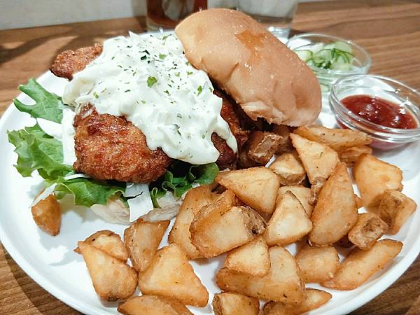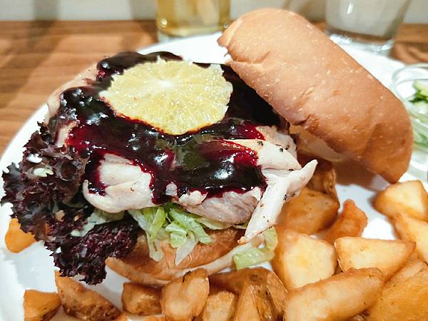 後來巧巧點了塔塔醬唐揚雞腿,我點了煎雞肉香橙野莓堡,